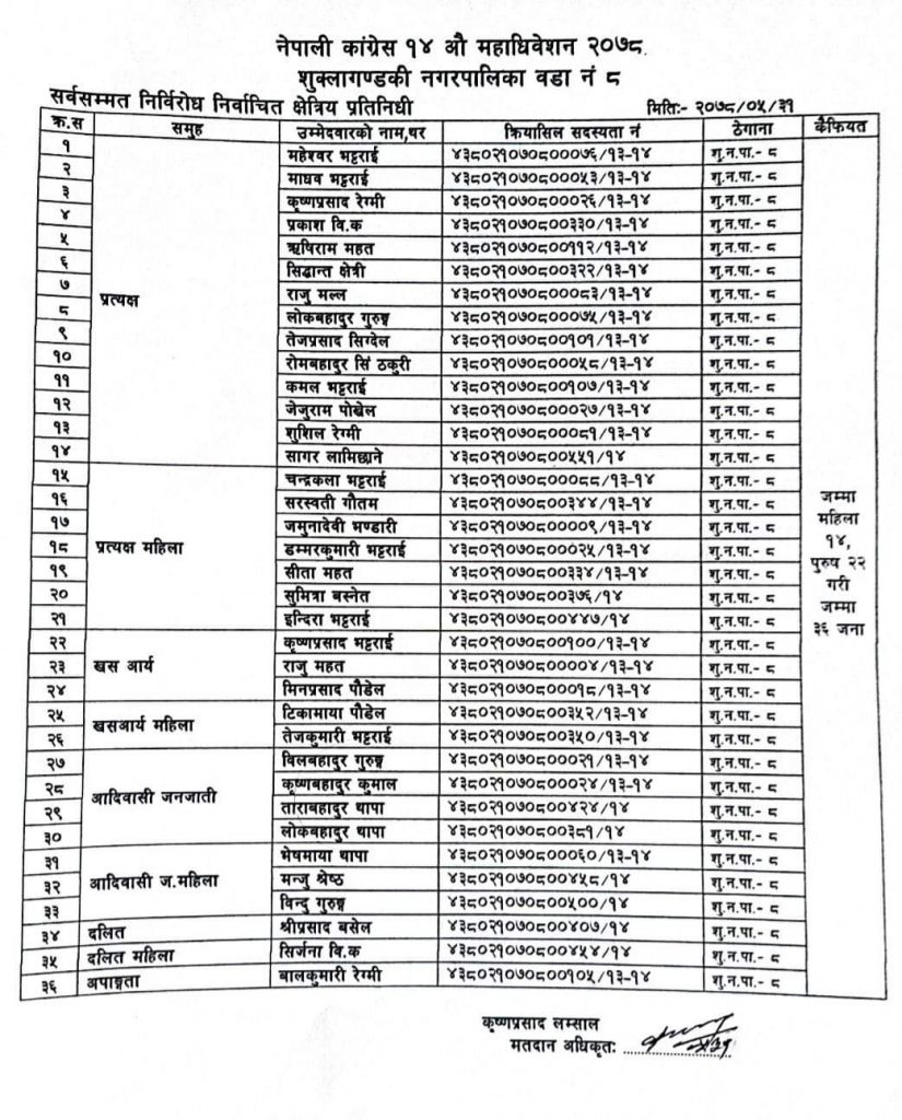 वडाको ३७ जना क्षेत्रीय प्रतिनिधि समेत सर्वसम्मत घोषणा गरिएको पार्टी वडाका निवर्तमान सभापति कृष्ण रेग्मीले बताए ।