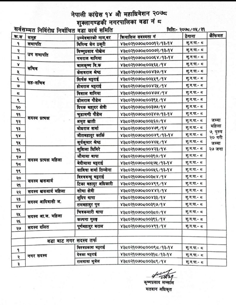दुलेगौँडा: लामो अड्कलबाजी र अन्यौलकाबीच शुक्लागण्डकी ८ को नेपाली कांग्रेस वडा समितिको घोषणा गरिएको छ ।