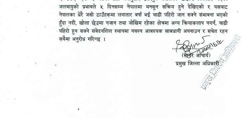 मनसुन सक्रिय भए पछि देशका धेरै ठाउँमा लगातार वर्षा भै बाढी पहिरोको सम्भावना रहेको गृह मन्त्रालयको राष्ट्रिय जोखिम न्यूनीकरण तथा व्यवस्थापन प्राधिकरणको पत्र प्राप्त भएको भन्दै प्रमुख जिल्ला अधिकारी सागर आचार्यद्वारा जारी पत्रमा नदी तथा खोला छेउ नजान र बाढी पहिरोको संवेदनशील क्षेत्रमा नबस्न र सावधानी अपनाउन आग्रह गरिएको छ ।