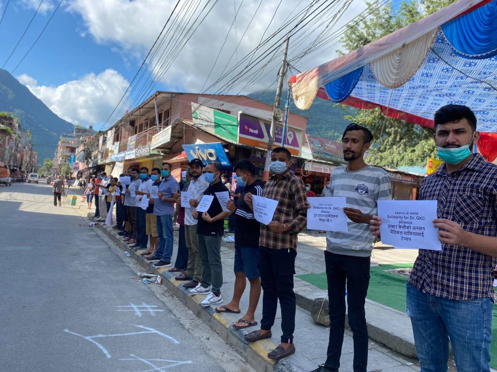 दमौली: चिकित्सा क्षेत्रमा सुधारको माग गर्दै आन्दोलनरत डा. गोेविन्द केसीको पक्षमा दमौलीमा प्रदर्शन गरिएको छ । युथ कांग्रेस नेपाल तनहुँको आयोजनामा दमौली ट्राफिक चोकमा कार्यक्रम गर्दै विभिन्न प्ले कार्डहरु प्रदर्शन गरिएको हो ।