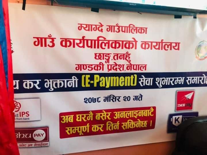 म्याग्दे: म्याग्दे गाउँपालिका विद्युतिय कर भुक्तानी सेवा सुविधा दिनेमा तनहुँमै पहिलो भएको छ । मंसिर २० गते अाइतवार गाउँपालिकामा अायाेजित एक कार्यक्रमकाबीच गाउँपालिका अध्यक्ष मायादेवी रानाले कर भुक्तानी सेवा सुभारम्भ गरिन् ।