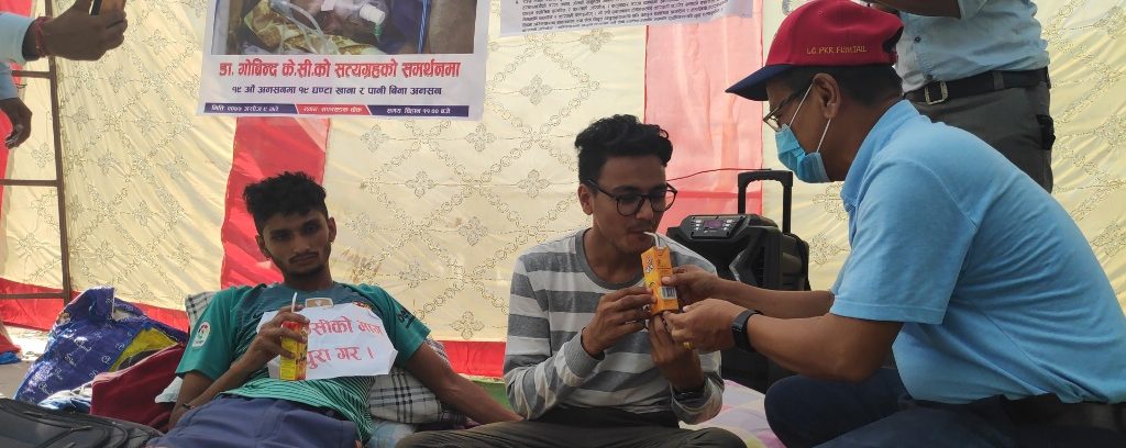 दमौलीः स्वास्थ्यले साथ नदिए पछि दमौलीमा अनशन बसेका दुई युवाको अनशन तोडिएको छ । चिकित्सा क्षेत्रमा सुधारको माग राख्दै अनशन बसिरहेका चिकित्सक गोविन्द केसीको अनशनमा ऐक्यबद्धता जनाउन अनशन बसेका युवा सागर घिमिरेको स्वास्थ्य अवस्थामा खराबी आए पछि शनिबार अनशन तोडिएको हो ।