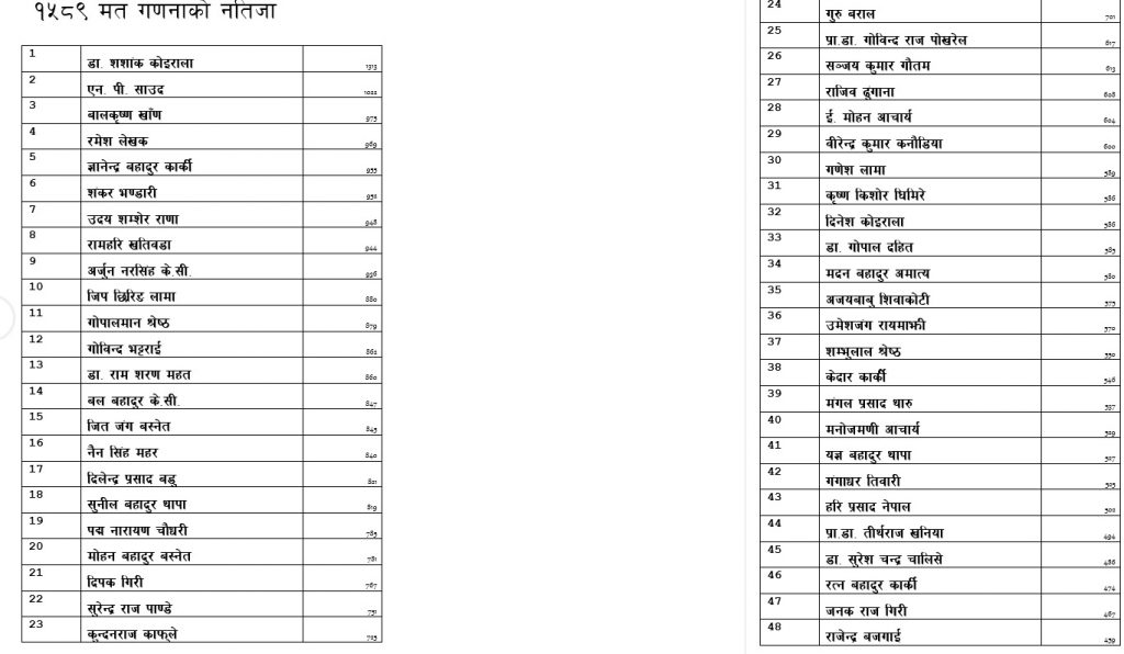 तर, खुलातर्फ नै लडेका दीपक भटटराई र आनन्द त्रिपाठीले अन्तिम ३५ मा पर्न अब अप्रत्याशित अग्रता लिनुपर्नेछ । हालसम्म निर्वाचन समितिले उपलब्ध गराएको परिणाम यस्तो छ ।