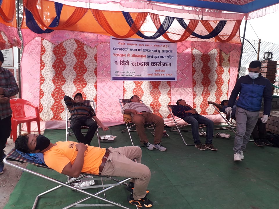 ईसाइहरूकाे महान पर्व ख्रिष्टमसकाे अवसरमा रक्तदान नैं जीवन दान हाे भन्ने मुल नाराका साथ रक्तदान कार्यक्रम भएको समाजका अध्यक्ष केवि अालेले बताए ।