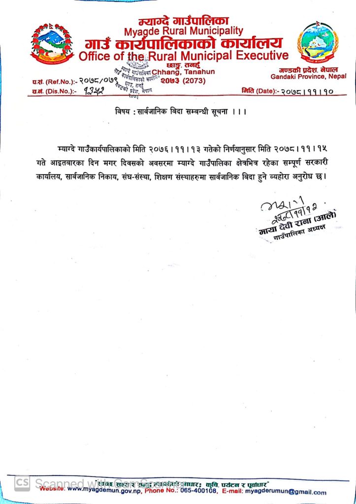 अध्यक्ष मायादेवी रानाद्वारा हस्ताक्षरित सुचनामा सम्पुर्ण सरकारी कार्यालय संघसंस्था , शिक्षण संस्था बन्द रहने उल्लेख गरिएको छ ।