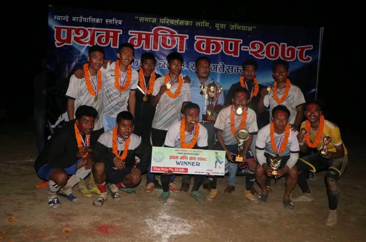 थर्पुः म्याग्दे–४, छिम्लिस्वाँरामा रहेको मणि युवा क्लबको २१औं वार्षिकोत्सवको अवसरमा आयोजित प्रथम मणि कप फुटबल प्रतियोगिताको उपाधि आदर्श नमुना क्लबले जितेको छ । आइतवार सम्पन्न फाइनल खेलमा आयोजक मणि युवा क्लबलाई हराउँदै आदर्शले फाइनल जितेको हो ।