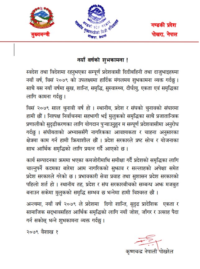 नयाँ वर्ष २०७९ ले प्रदेशमा दिगो शान्ति, सुदृढ प्रादेशिक एकता र सामाजिक सद्भावसहित आर्थिक समृद्धिको लागि नयाँ जोश, जाँगर र उत्साह पैदा गर्न सकोस् भन्दै उनले शुभकामना व्यक्त गरेका छन् ।
