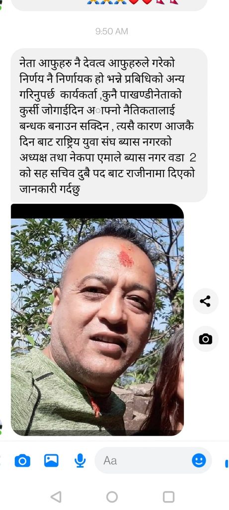 सामाजिक सञ्जालमा एक पोष्ट गर्दै एमाले व्यास २ का वडा सह सचिवसमेत रहेका उनले नेताहरुले आफूलाई देवत्वकरण गरेको र जे भन्यो त्यही मान्नुपर्ने अवस्था आएकाले राजिनामा दिएको उल्लेख गरेका छन् ।