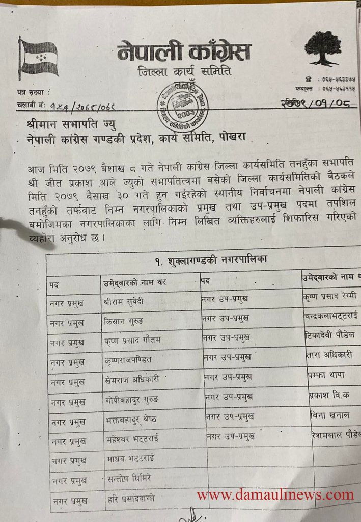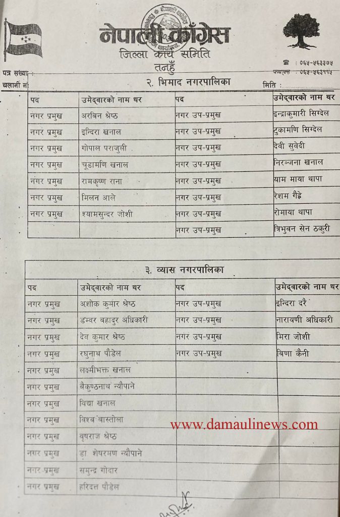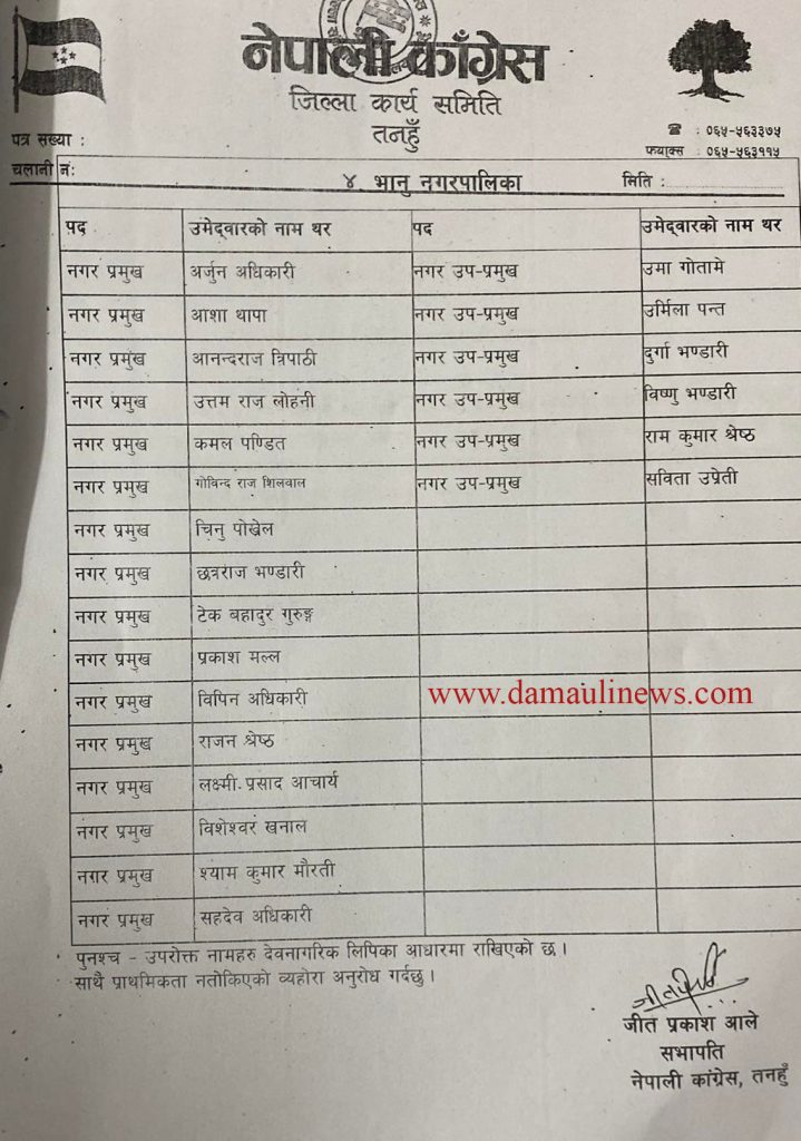 दमौलीः नेपाली कांग्रेस तनहुँले जिल्लाका विभिन्न तहबाट आएका तह प्रमुखको उम्मेदवारको नाम प्रदेश समितिमा सिफारिस गरेको छ ।