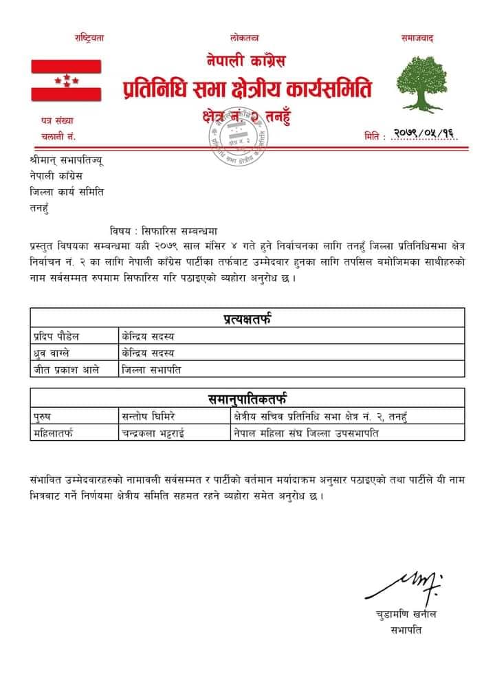 पार्टी क्षेत्रीय सभापति चुडामणि खनालका अनुसार सर्वसम्मत रुपमा पौडेलसहित अर्का केन्द्रीय सदस्य ध्रुव वाग्ले अनि जिल्ला सभापति जितप्रकाश आलेको नाम प्रत्यक्षतर्फ सिफारिस गरिएको हो ।