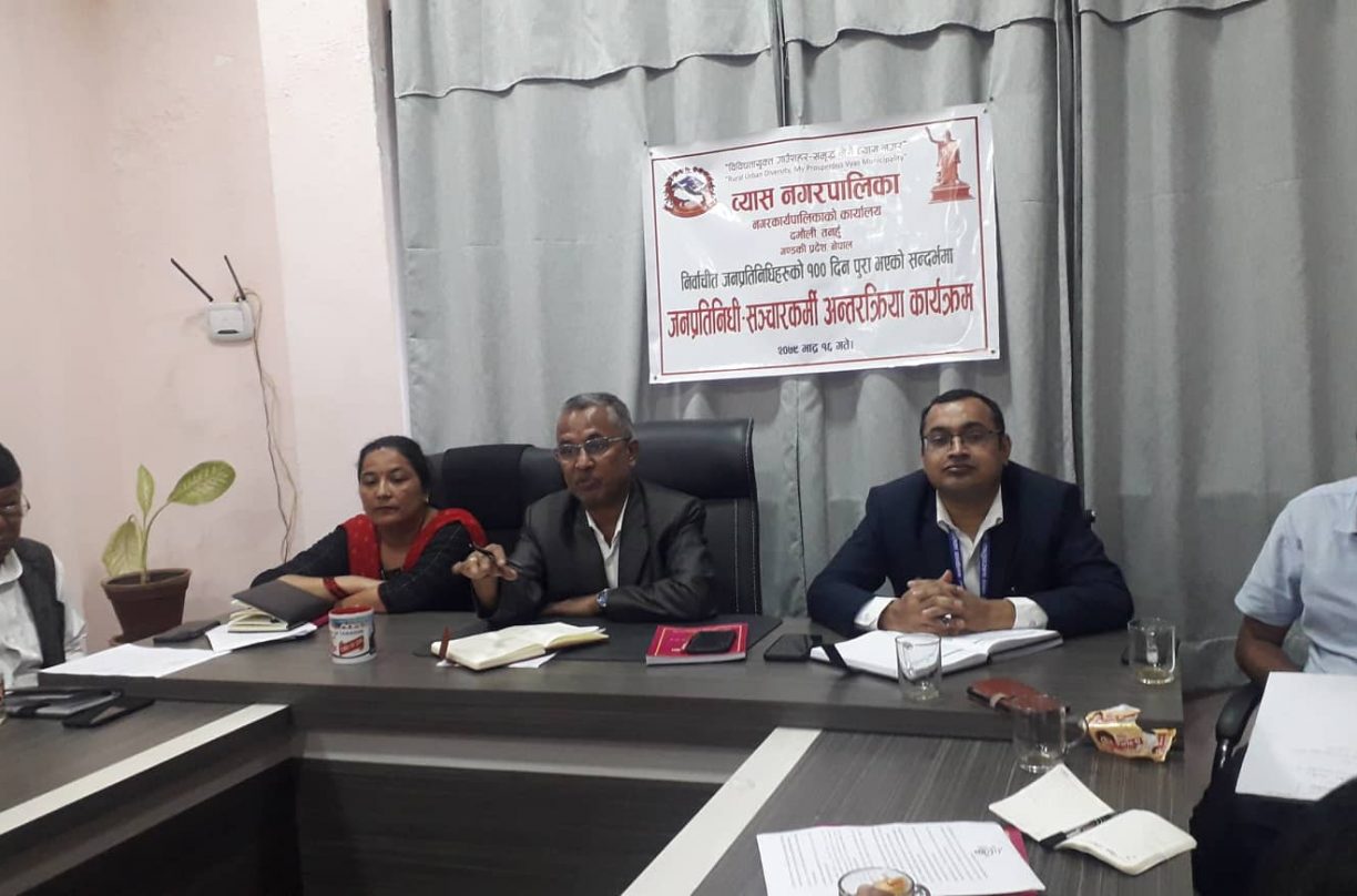 स्थानीय तहको निर्वाचनमा निर्वाचित भएर पदभार ग्रहण पश्चात व्यासका जनप्रतिनिधिले गरेका कार्यका बारेमा जानकारी दिन आयोजित पत्रकार सम्मेलनमा नगरप्रमुख बैकुण्ठ न्यौपानेले नगरपालिकाले सहायता कक्ष स्थापना देखि निःशुल्क शिक्षा प्रदान लगायतका कार्यहरु गरेको बताए ।