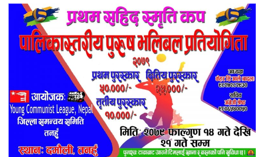 दमौलीमा आयोजना हुने ‘प्रथम सहिद स्मृति कप पालिकास्तरीय पुरूष भलिबल प्रतियोगिता –२०७९’ फागुन १४ गते देखी २१ गते सम्म आयोजना हुने वाईसीएल तनहुँका अध्यक्ष केयर सि आले (बादल)ले बताए ।