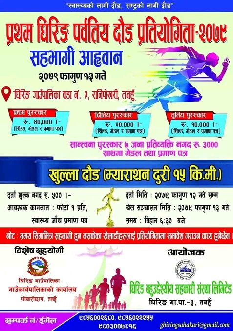 घिरिङ : घिरिङ बहुउद्देश्यीय सहकारी संस्था लिमिटेडको आयोजनामा प्रथम घिरिङ पर्वतिय खुल्ला दौड प्रतियोगिता हुने भएको छ । फागुन १३ गते शनिवार दौड प्रतियोगिताको आयोजना गर्न लागिएको होे ।