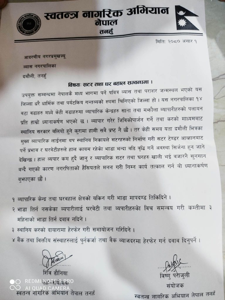 नागरिक स्वतन्त्र अभियान नेपालका संयोजक विष्णु पराजुलीको संयोजकमा सटर तथा घर बहाल व्यापारीहरुको समस्याका ४ सुत्रियामाग सहित शुक्रबार नगरप्रमुखको कार्याकक्षमा गई ज्ञापन पत्र दिईएको हो ।