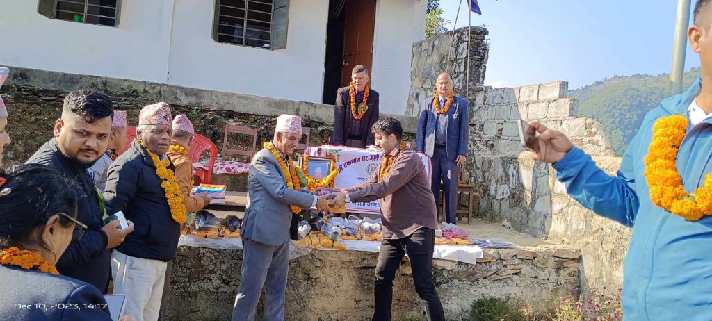 भिमाद : भिमाद नगरपालिका वडा नं ७ मा रहेको सिद्धज्योति आ.वि.मा अध्ययनरत विद्यार्थीहरुलाई जाडोमा लगाउने न्यानो पोशाक सहित शैक्षिक सामाग्री वितरण गरिएको छ । स्व. टंकनाथ पराजुलीको नवौं वार्षिक स्मृति दिवसका अवसरमा विद्ययार्थीहरुलाई न्यानो कपडा,जुत्ता,मोजा र कपी वितरण गरीएको हो । कार्यक्रमलाई पराजुली पेपर एण्ड एलाइड इन्डस्ट्री,काठमाडौंका प्रोप्राइटर रामेश्वर पराजुलीले कपी सौजन्य गरेका थिए ।
