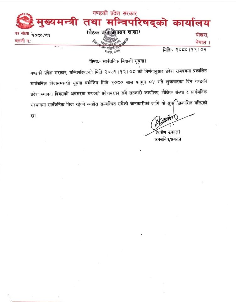 एक सुचना जारी गर्दै गण्डकी प्रदेशको स्थापना दिवसको अवसरमा गण्डकी प्रदेश भरका सवै सरकारी कार्यालय, शैक्षिक सस्था र सार्वजनिक स्थानमा विदा रहेको मुख्यमन्त्री तथा मन्त्रिपरिषद्को कार्यालयले जनाएको छ ।