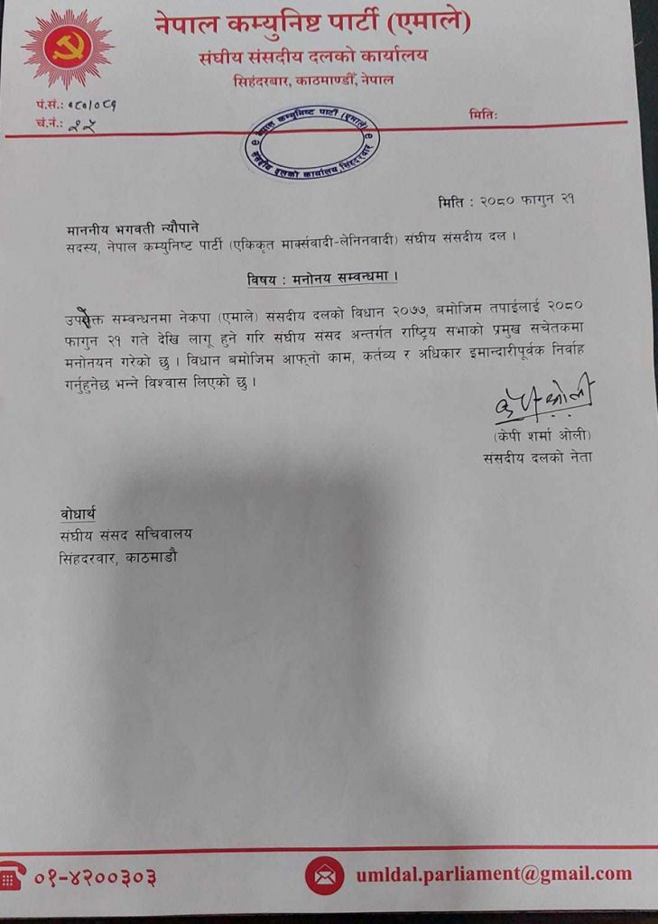 यसअघि, राष्ट्रिय सभामा प्रमुख सचेतक रहेका भैरवसुन्दर श्रेष्ठको कार्यकाल सकिएर बिदा भएका छन् । यो सँगै ओलीले सांसद न्यौपानेलाई प्रमुख सचेतकमा मनोनयन गरेका हुन् । अनलाइनखबर