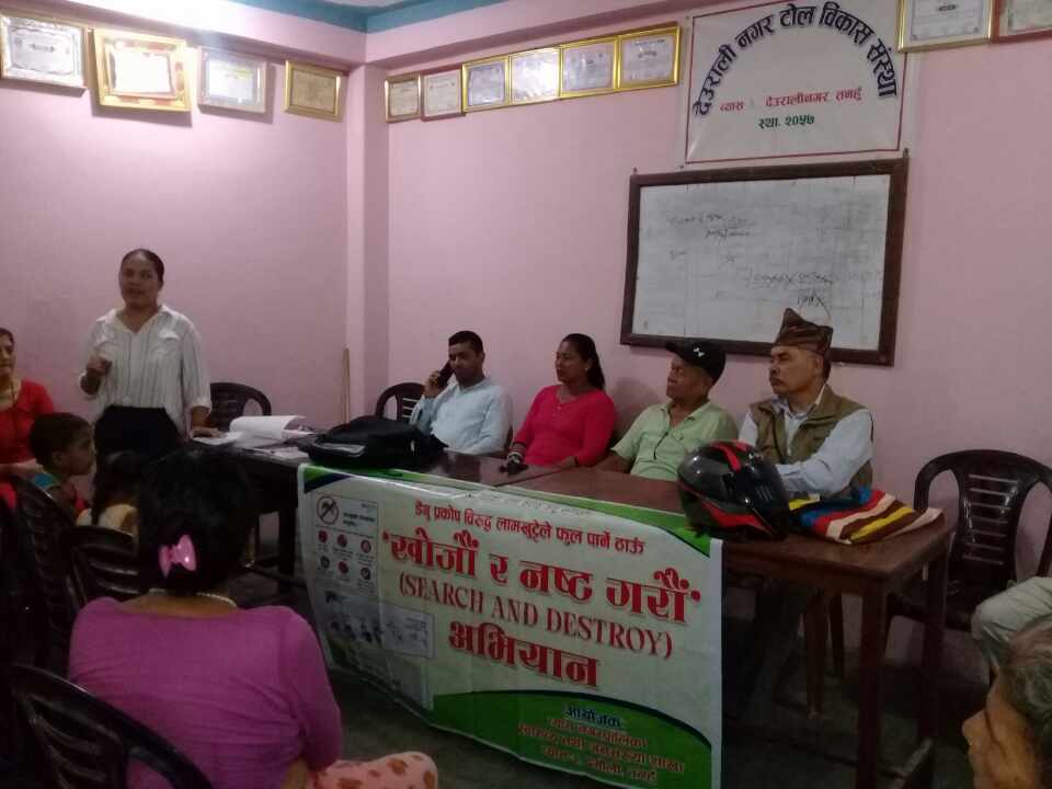 जनप्रतिनिधी र स्वास्थ्य स्वयसेविका लगायतका टोलीले देउरालीनगर विसघरेको, देउराली नगर टोल,पुल्चोक टोल र बुद्धपार्क टोलका बासिन्दाहरुलाई एकै ठाउँमा भेला गराई डेङ्गो बाट जोगिनका लागि सचेतना जगाउने कार्य गरीएको वडा सदस्य दधिराज घिमिरेले बताए ।
