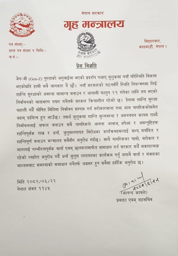 जेन–जी पुस्ताको अगुवाईमा भएको प्रदर्शन र विध्वंशपछि मुलुकमा नयाँ राजनीतिक परिस्थिति विकास भएको भन्दै मन्त्रालयले सबैलाई संवेदनशील रहन अनुरोध गरेको छ। सरकारले शान्ति सुरक्षा स्थापनामा ध्यान दिँदै आगामी फागुन २१ गतेका लागि तय प्रतिनिधिसभा निर्वाचनको वातावरण तयार पार्न क्रियाशील रहेको दाबी गरेको छ।