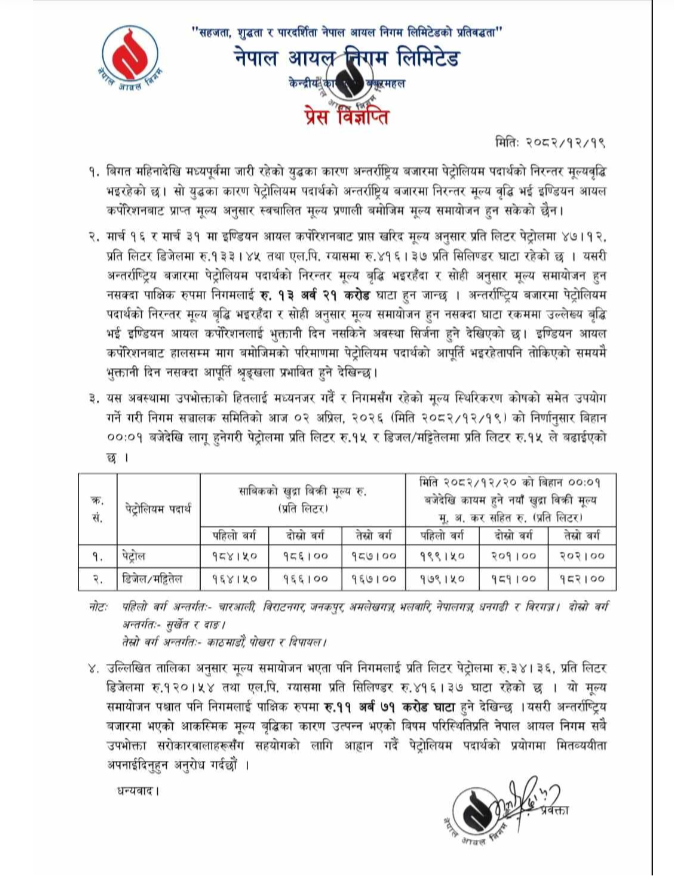 निगम सञ्चालक समितिको बिहीबारको बैठकले उक्त मूल्य निर्धारण गरेको हो। नयाँ मूल्य राति १२ बजेदेखि लागू हुनेछ।