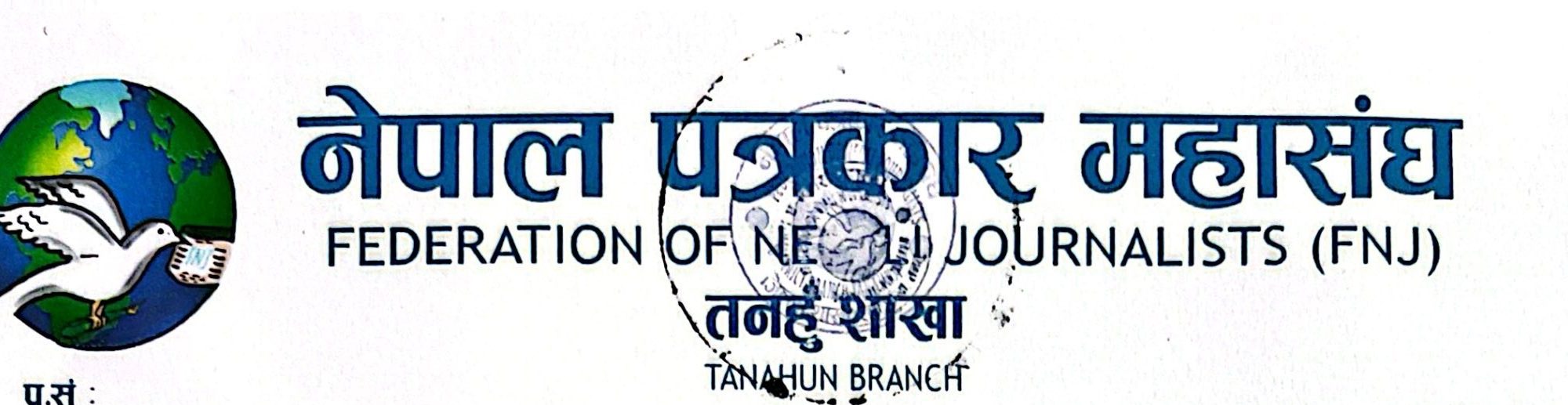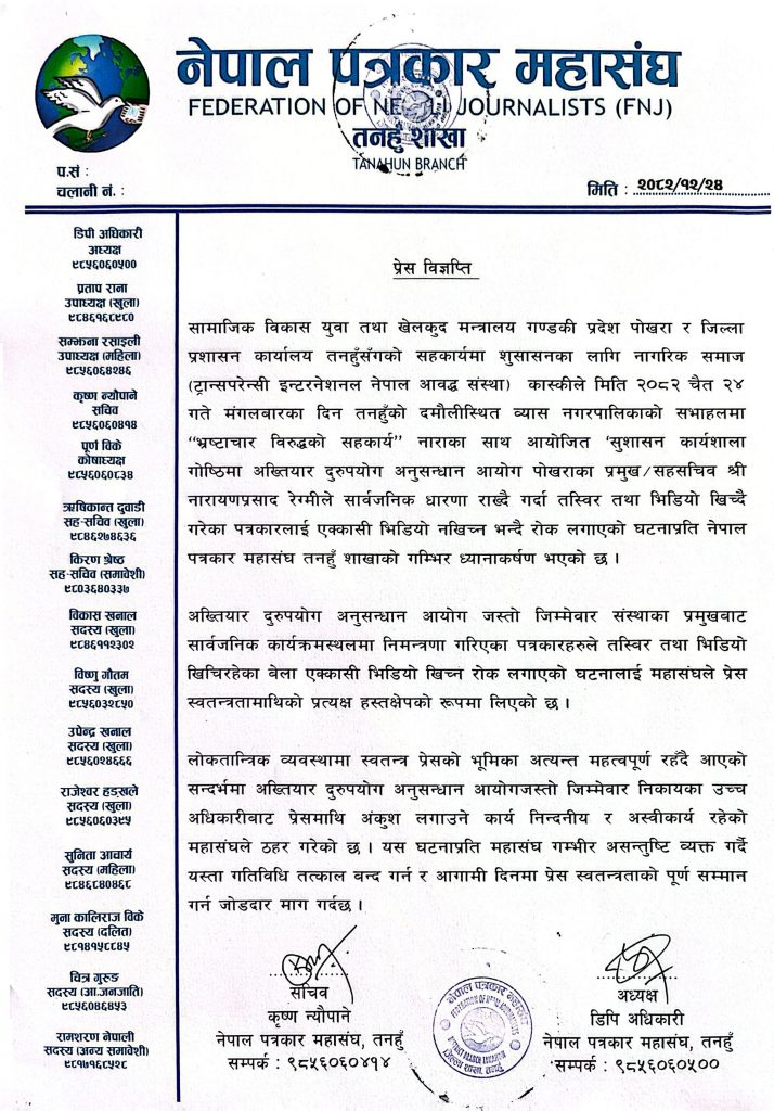 दमौली : नेपाल पत्रकार महासंघ तनहुँ शाखाले पत्रकारलाई भिडियो खिच्न रोक लगाइएको घटनाप्रति गम्भीर आपत्ति जनाएको छ।