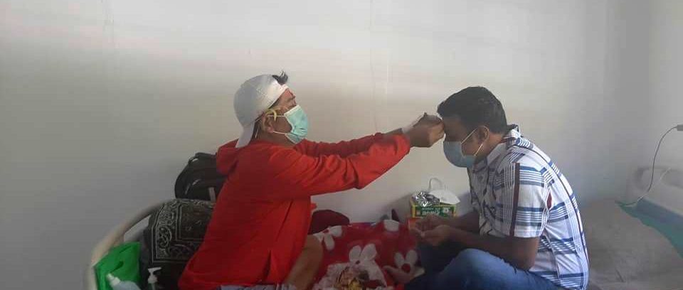 श्रेष्ठको घरबाट परिवारले पठाइदिएको टीका गुरुङले श्रेष्ठलाई लगाईदिनुभएको थियो । टीका थापेपछि श्रेष्ठले परिवारसँग टिका थाप्न नपाए पनि भर्चुअल सम्वाद भने गरेको बताए । ‘घरमा भर्चुअल तरिकाले कुराकानी गरियो,’ उनले भने । चाँडै पछिल्लो परीक्षणको रिपोर्ट आएर नेगेटिभ भएमा दुवै जना घर फर्कने तयारीमा छन् ।