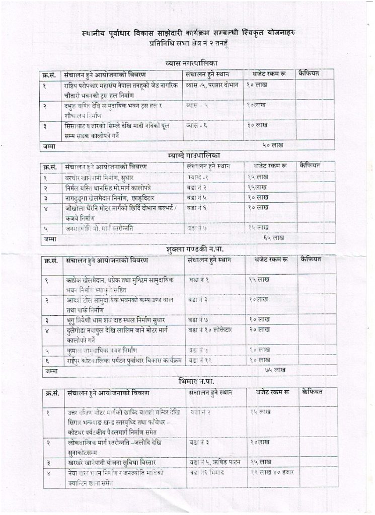 कार्यक्रमअन्र्तगत व्यास नगरपािलकाको वडा नं ५ मा राष्ट्रिय परोपकार महासंघ नेपाल तनहूँको जेष्ठ नागरिक चौतारी भवनको ट्रस हल निर्माणका लागी १० लाख, दभुङ्ग चण्डीदेवी गुठी सामुदायिक भवनको ट्रस र शौचालय निर्माणका लागी १० लाख, व्यास ६ को शिसाघाट वजारको सिम्लेदेखि मादी नदिको पूल सम्म सडक कालोपत्रे गर्नका लागी ३० लाख गरि व्यासको ५ र ६ नं वडामा ५० लाख विनियोजन भएको छ ।