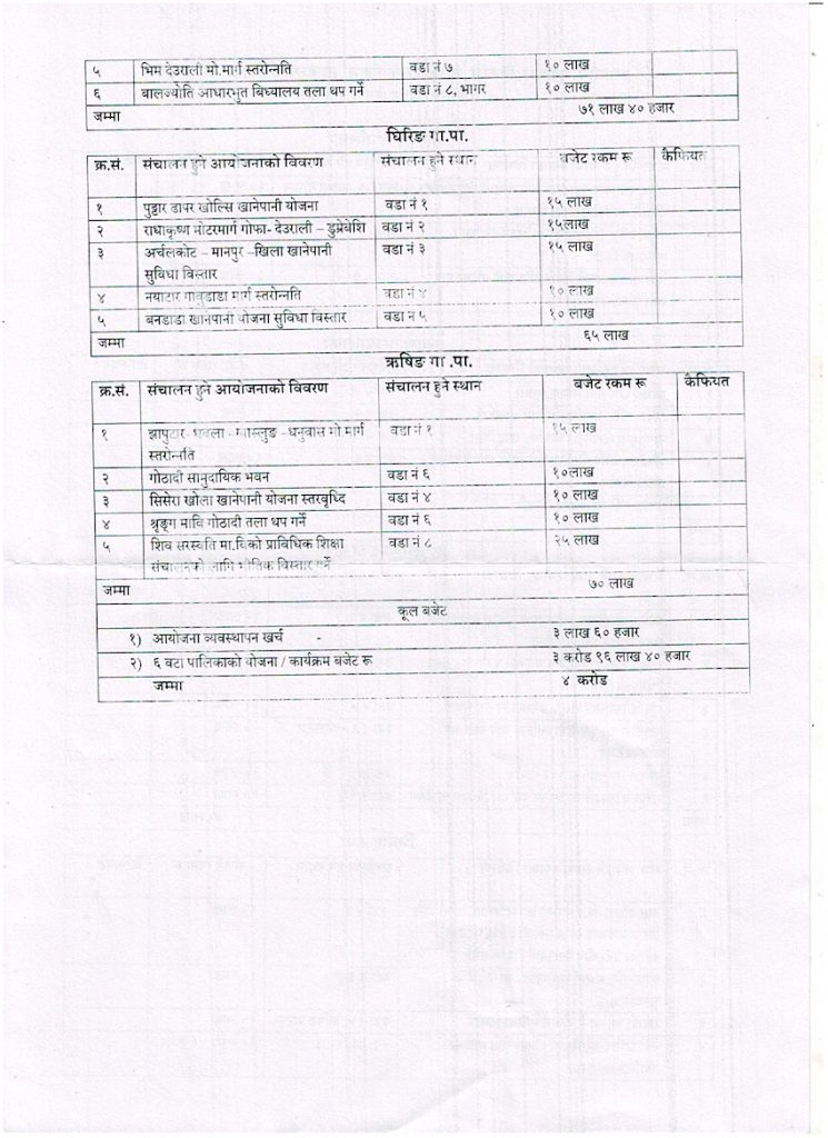 यस्तै, घिरिङ्ग गाउँपालिकामा पुट्टार ढोपर खोल्सी खानेपानी योजनाका लागी १५ लाख, राधाकृष्ण मोटरमार्ग गोफा–देउराली–डुम्रेवेशी का लागी १५ लाख, अर्चलकोट–मानपुर–खिला खानेपानी सुविधा विस्तारका लागी १५ लाख, नयाँटार गावुडाडा मार्ग स्तरोन्नतीका लागी १० लाख, वनडाँडा खानेपानी योजना सुविधा विस्तारका लागी १० लाख गरि कुल ६५ लाख विनियोजन गरिएको छ ।