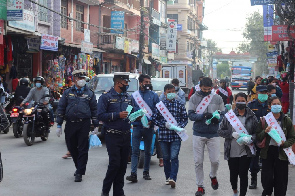 मास्क नलगाउने क्रम बढेकाले सचेतनास्वरुप सडकमा मास्क वितरण गरेर कोरोनाबाट जोगिन सन्देश दिएको संस्थाका अध्यक्ष गोविन्द तिमिल्सेनाले बताए । संस्थाले करिब तीन सय मास्क भने ट्राफिक प्रहरीलाई हस्तान्तरण गरेको छ ।