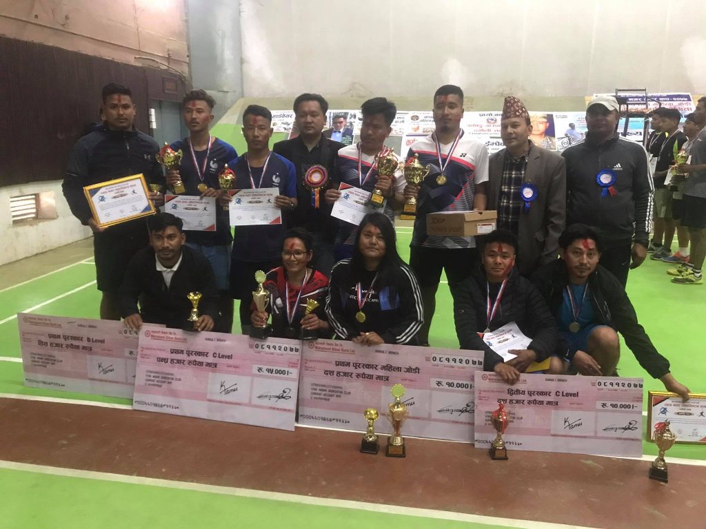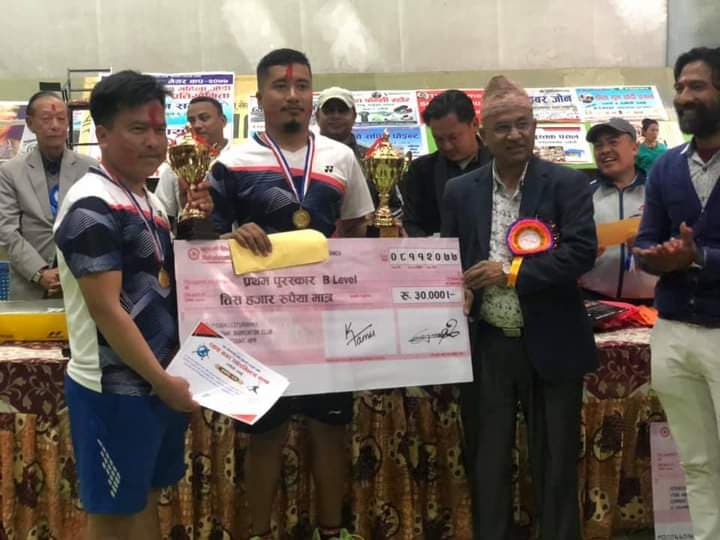 बि लेभलतर्फ व्यास नगर ब्याडमिन्टन क्लबका बिपिन घले र ठगेन्द्र राना विजेता भएका छन् । उनीहरुले धादिङका राम मल्लठकुरी र लक्ष्मण मल्लठकुरीको जोडीलाई ११–२१, २१–१३ र २१–१५ को सेटले हराएका थिए ।