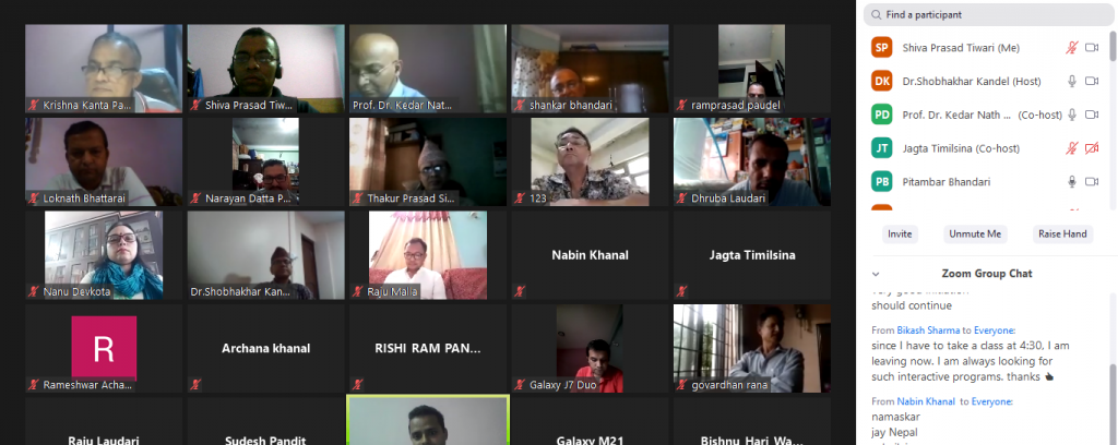 काठमाडौं: तनहुँका विभिन्न स्थानबाट आएर काठमाडौंका विभिन्न कलेज र विश्वविद्यालयमा अध्यापन गर्ने नेपाल प्रजातान्त्रिक प्राध्यापक संघमा आस्था राख्ने प्राध्यापकहरुले नेपालको वर्तमान राजनीति र प्रजातन्त्रको अवस्थाका बारेमा भच्र्युअल माध्यमबाट छलफल गरेका छन् ।