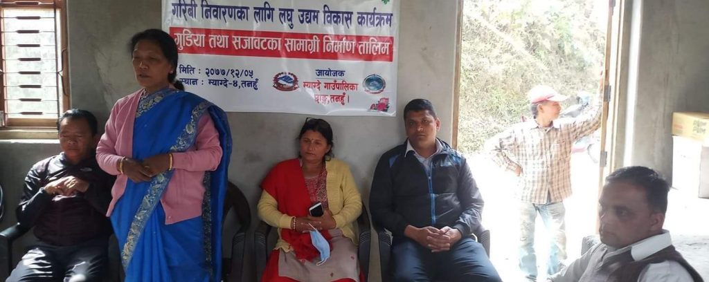 म्याग्दे : म्याग्दे गाउँपालिकाकाे आयाेजनामा १० दिने गुडिया तथा सजावटका सामाग्री निर्माण एवं पार्लर तालिम सुरु भएको छ । तालिमको एक कार्यक्रमका विच प्रमुख अतिथि म्याग्दे गाउँपालिकाका अध्यक्ष मायादेवी रानाले उद्घाटन गरिन् । तालिमको उद्घाटन गर्दै रानाले तालिमले महिलाहरू लाई आत्मनिर्भर बन्न सघाउने बताइन् । तालिम लिएर बिचमै नछाेड्नु , ब्यबहारमा उतार्नु र स्वाबलम्वि बन्नु रानाको भनाइ थियो । २१ जनाको सहभागीता रहेको तालिममा सुस्मा भट्टराई नागिला सहजकर्ताकाे रूपमा छन् भने प्रशिक्षककाे रूपमा कविता नेपाली र नन्द कुमारी राई रहेका छन् । म्याग्दे ४ का अध्यक्ष प्रेम बहादुर थापाको अध्यक्षतामा भएको गरिबी निवारणका लागि लघु उद्धमी विकास कार्यक्रम मेडपा अन्तर्गतको सीप विकास तालिमकाे सञ्चालन शाखा अधिकृत प्रदिप न्याैपानेले गरेका थिए । साे अवसरमा कार्यपालिका सदस्य बद्रिका घिमिरे , लेखा अधिकृत नवराज पाेख्रेल लगायतका बक्ताहरूले तालिमकाे सफलताको सुभकामना दिएका थिए ।