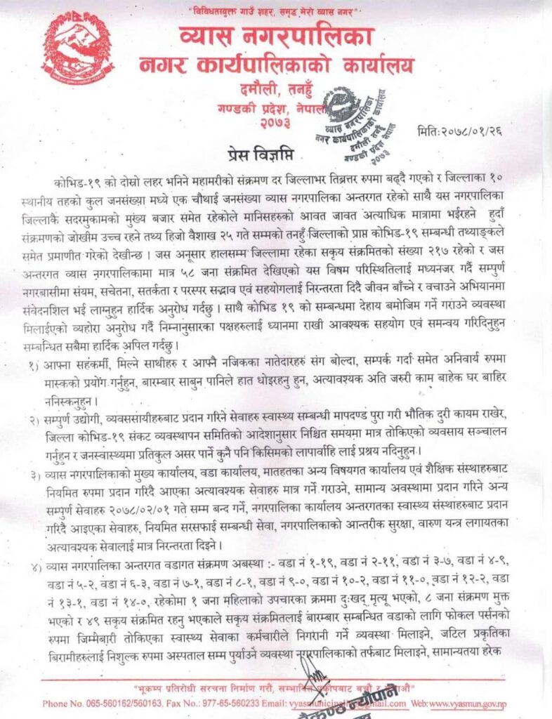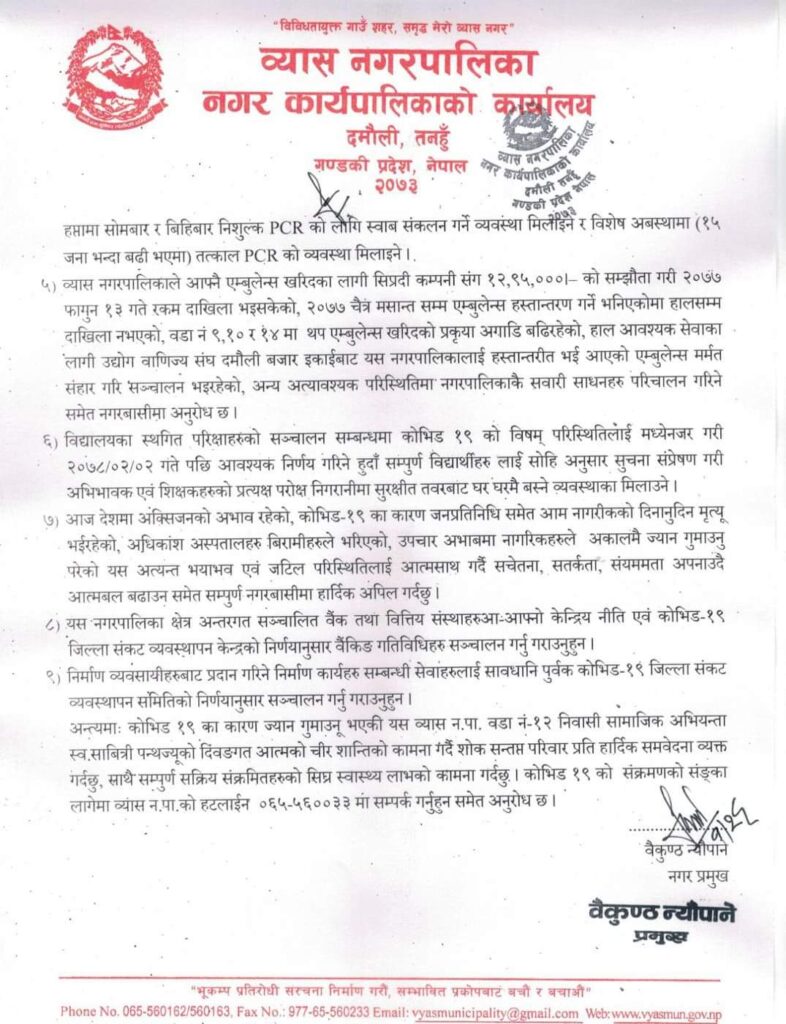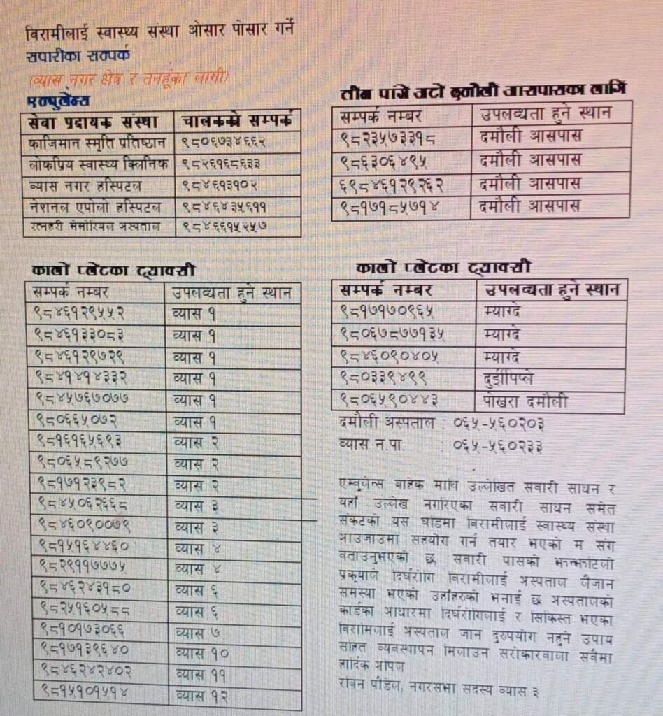 दमौली: व्यास नगरपालिकाले एम्बुलेन्स नपुगेमा आफ्नै साधन प्रयोग गर्न दिने बताएको छ । आईतबार बसेको नगर कार्यपालिका बैठकले नगरपालिकाले खरिद गर्न रकम बुझाए पनि आपूर्ति नभएको भन्दै तनहुँ उद्योग वाणिज्य संघ दमौली बजार एकाईले दिएको एम्बुलेन्स मर्मत गरेर सञ्चालन गरिरहेको भन्दै कोभिड संकटमा आवश्यक परे अरु साधन पनि उपयोग गर्ने निर्णय गरेको छ ।