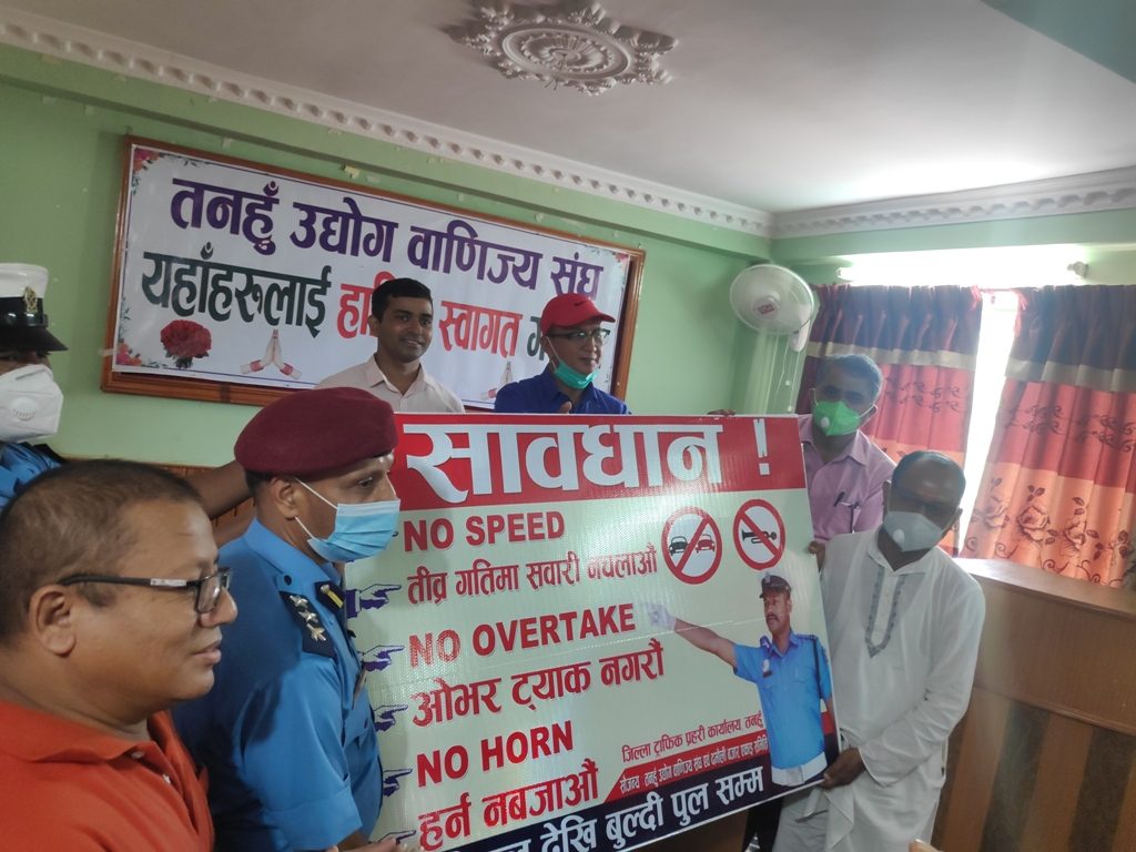 तनहुँ उद्योग वाणिज्य संघ र दमौली बजार एकाई समितिको सहकार्यमा ट्राफिकले सवारी सञ्चालनका नियमहरु ब्जारको प्रवेशबिन्दुमा राखिएको छ । यसले नवप्रवेशीलाई गति घटाउन, ओभरटेक रोक्न र हर्न नबजाउन जानकारी दिनेछ ।