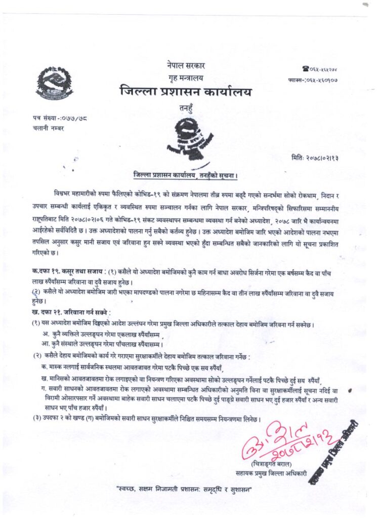 यस अघि संक्रामक रोग िनयन्त्रण ऐनअन्र्तगत निषेधाज्ञा अटेर गर्नेलाई एक सय रुपैयाँसम्म जरिवाना गराइंदै आएकोमा अब नयाँ अध्यादेशअन्र्तगत जरिवाना लिन लागिएको सहायक प्रमुख जिल्ला अधिकारी चित्रांगत बरालले अध्यादेशअनुसार नै अब कारबाही हुने बताए ।
